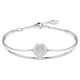 In tribute to the cosmos, this starry bangle is filled with light-catching joy. Around the wrist, the rhodium-plated design features a rigid band alongside a delicate chain with a domed meteor motif. This has been beautifully adorned with a snow pavé of clear round crystals in different sizes. Pair this bangle with a matching pendant to elevate any outfit.